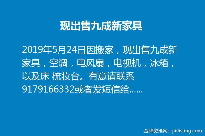 因搬家,现出售九成新家具,空调,电风扇,电视机,冰箱,以及床 梳妆台。有意请联系9179166332或者发短信给192… 地址是992 broadway brooklyn.