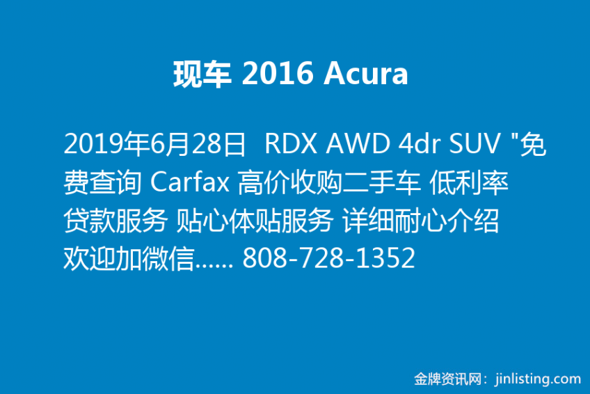 现车 2016 Acura RDX AWD 4dr SUV “免费查询 Carfax 高价收购二手车 低利率贷款服务 贴心体贴服务 详细耐心介绍 欢迎加微信 咨询详谈 Kingzhen1688 808-728-1352 Johnson 甄先生 地址 67 街 14 大道 布鲁克林 华龙汽车城 6124 New Utrecht Ave Broooklyn NY 11219 車 輛 簡 介 舒适干净 高级豪华 倒车影像 蓝牙 四轮驱动 品牌: Acura 型号: RDX 里程:29,859英里 外觀:白色 發動機:3.5L V6 內飾:米色皮革 變速箱:自動6速 配置:AWD 4dr SUV 燃料類型:汽油 MPG城市/高速公路:19個城市/ 28個高速公路”