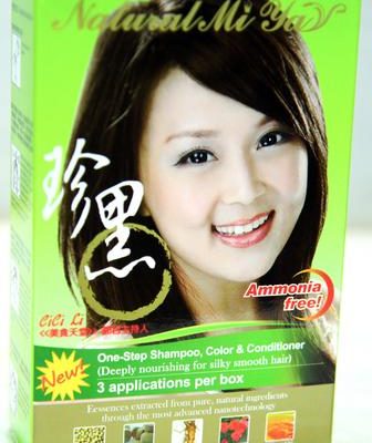 Natural Mi Ya“珍黑”植物染发护发乳,可以给秀发高分子最深层的保湿因子和营养,使美丽的秀发更柔软、滑顺,更光泽亮丽。染发、护发、洗发一次性完成最方便。产品萃取天然植物精华,原料来自大豆、人参、指甲花、小麦油、维他命E。有促进毛囊血液循环、抗衰老等效用。天然最可靠,自然最美丽。每盒3包,一次一包,供三次使用。有6种颜色:深色咖啡、自然黑色、中色咖啡、浅色咖啡、栗子红和金色。