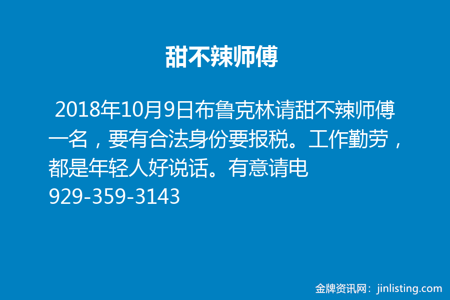 甜不辣师傅 布鲁克林请甜不辣师傅一名,要有合法身份要报税。工作勤劳,都是年轻人好说话。有意请电929-359-3143