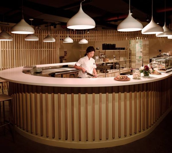 并配有木桌和榻榻米长椅、日式纸灯和季节性的花卉装饰,