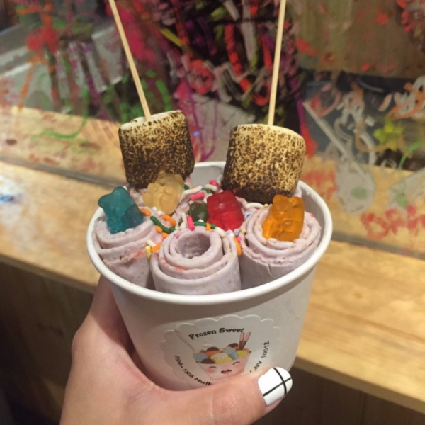 在Frozen Sweet,我们制作泰式卷冰淇淋。您会发现我们带有普通和非乳制的纯素食冰淇淋卷(用椰奶制成)。我们还提供无限的浇头-让您的想像力发狂。