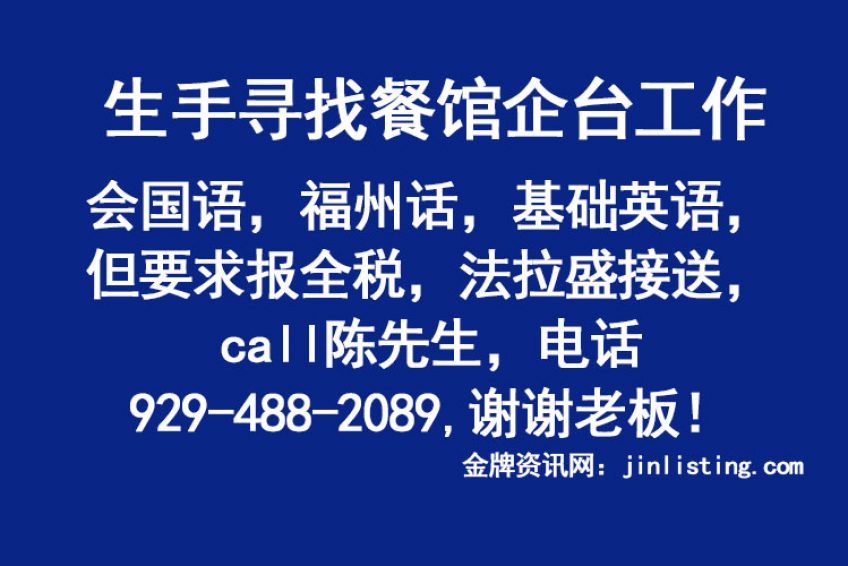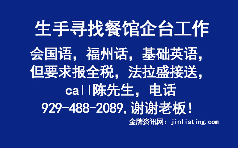 生手寻找餐馆企台工作,会国语,福州话,基础英语,但要求报全税,法拉盛接送,call陈先生,电话929-488-2089,谢谢老板!