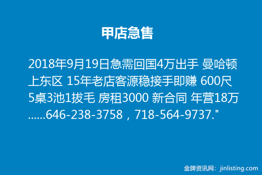 甲店急售 “急需回国4万出手 曼哈顿上东区 15年老店客源稳接手即赚 600尺5桌3池1拔毛 房租3000 新合同 年营18万 价格可商议 洽谈请电:646-238-3758,718-564-9737.”