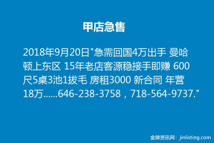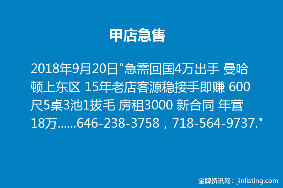 甲店急售 “急需回国4万出手 曼哈顿上东区 15年老店客源稳接手即赚 600尺5桌3池1拔毛 房租3000 新合同 年营18万 价格可商议 洽谈请电:646-238-3758,718-564-9737.”