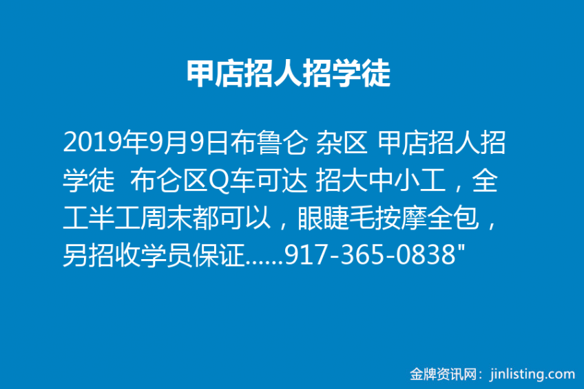布鲁仑 杂区 甲店招人招学徒 布仑区Q车可达 招大中小工,全工半工周末都可以,眼睫毛按摩全包,另招收学员保证一对一教学,留店工作电话917-365-0838″