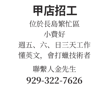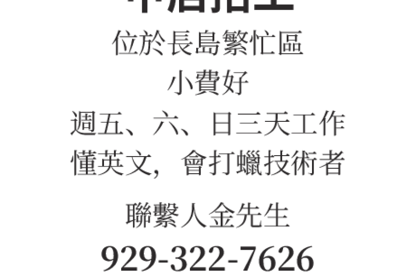 週五、六、日三天工作,懂英文 ,會打蠟 技術者。聯繫人 金先生929 322 7626