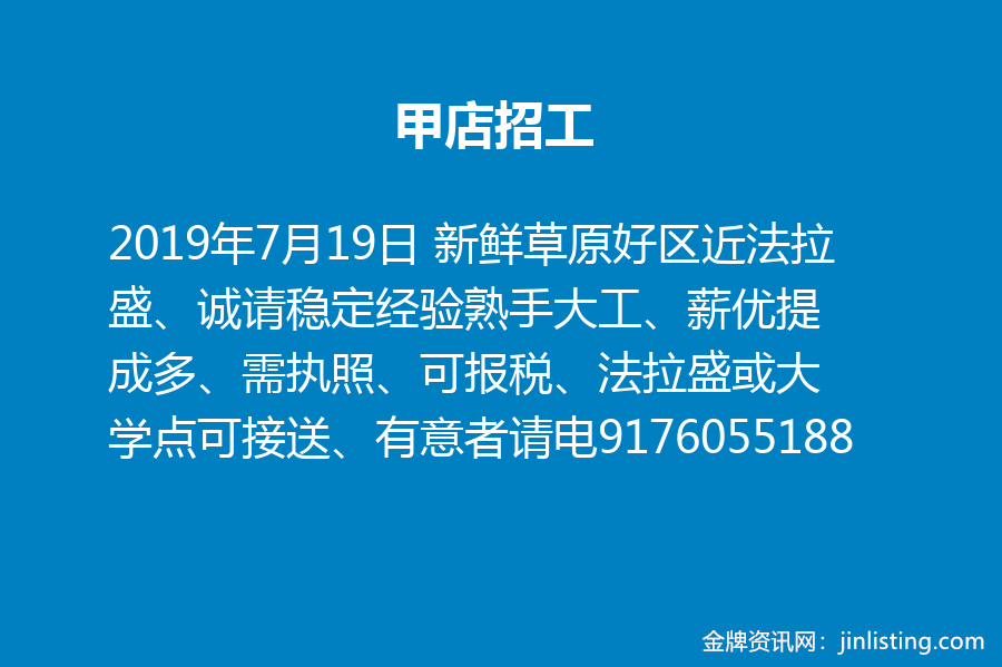 甲店招工、新鲜草原好区近法拉盛、诚请稳定经验熟手大工、薪优提成多、需执照、可报税、法拉盛或大学点可接送、有意者请电:9176055188