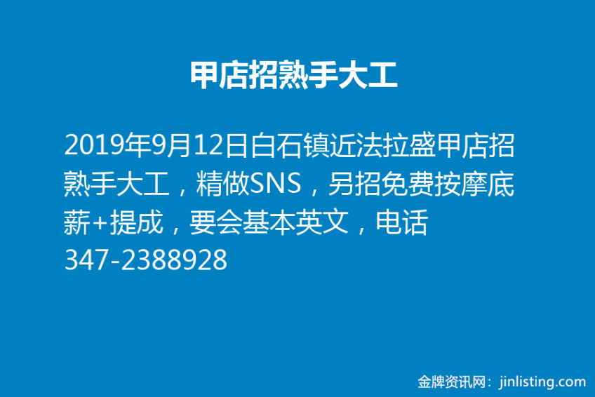 白石镇近法拉盛甲店招熟手大工,精做SNS,另招免费按摩底薪+提成,要会基本英文,电话347-2388928