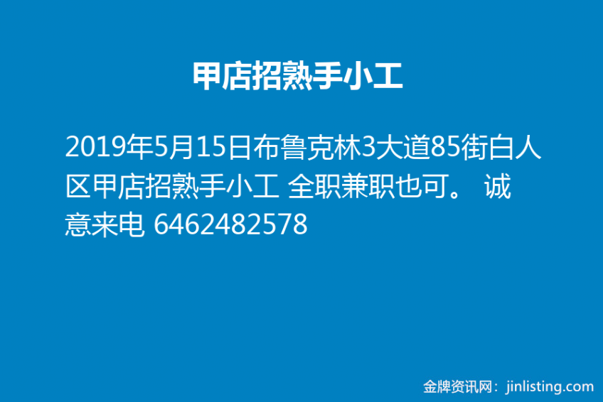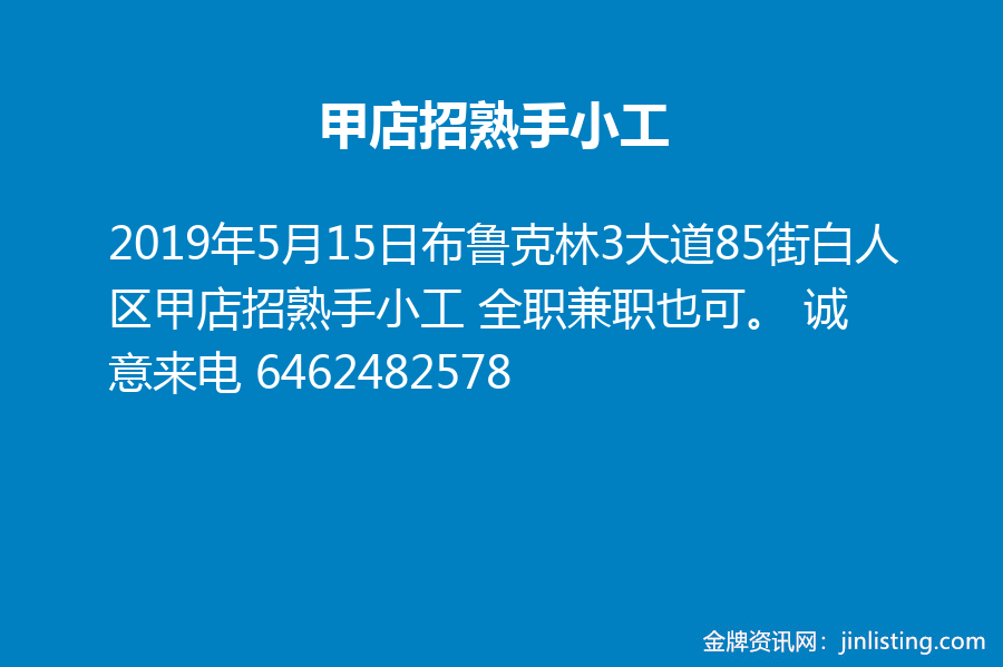 布鲁克林3大道85街白人区甲店招熟手小工 全职兼职也可。 诚意来电 6462482578