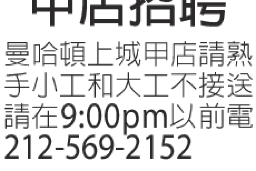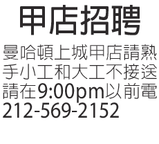 曼哈頓上城 甲店請熟手小工 和大工 不接送請電 212-569-2152 請電 9:00pm以前