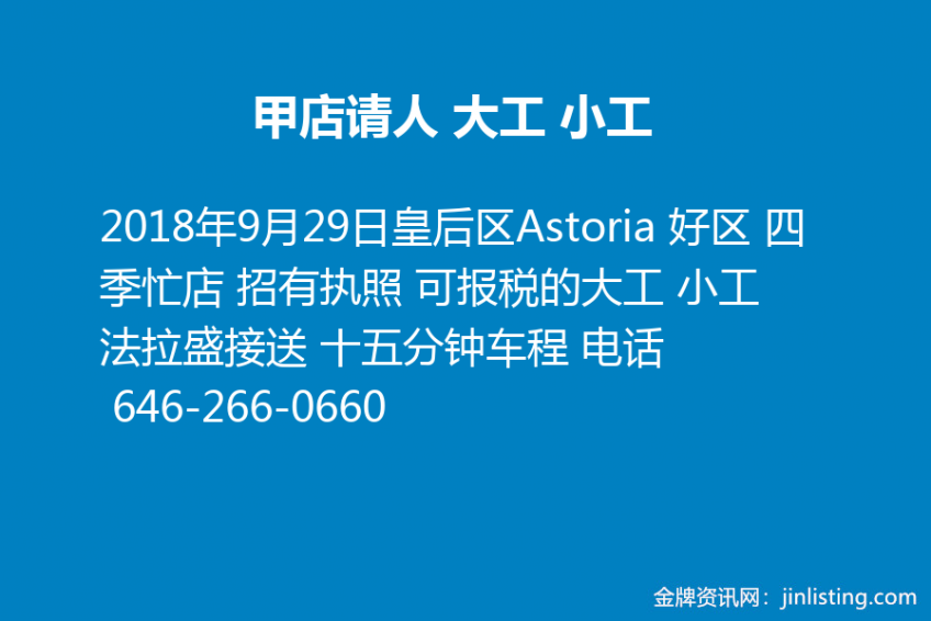 甲店请人 大工 小工 皇后区Astoria 好区 四季忙店 招有执照 可报税的大工 小工 法拉盛接送 十五分钟车程 电话☎️ 646-266-0660