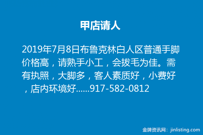 甲店请人 布鲁克林白人区普通手脚价格高,请熟手小工,会拔毛为佳。需有执照,大脚多,客人素质好,小费好,店内环境好,老板事少。 pt/ft均可。另请有经验、有责任心经理。距离C、N、G、R、F、2、3只有五分钟路程。20分地铁到八大道。联系电话 917-582-0812