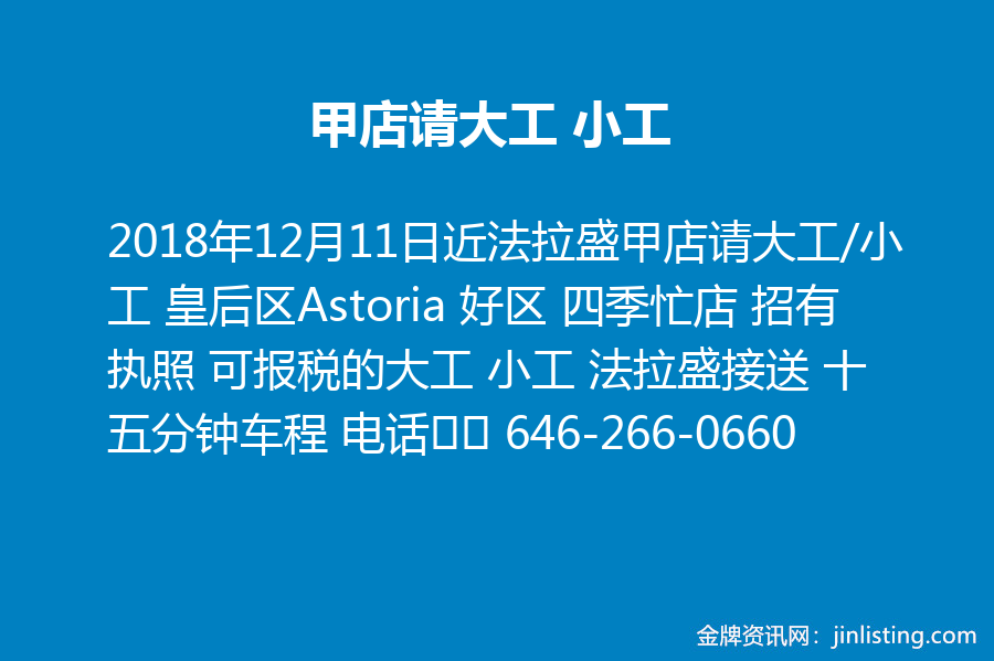 近法拉盛甲店请大工/小工 皇后区Astoria 好区 四季忙店 招有执照 可报税的大工 小工 法拉盛接送 十五分钟车程 电话☎️ 646-266-0660