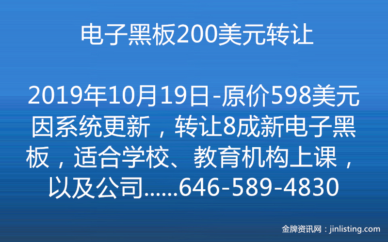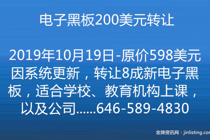 电子黑板200美元转让-原价598美元 因系统更新,转让8成新电子黑板,适合学校、教育机构上课,以及公司培训presentation使用。亚马逊同类产品598美元 https://www.amazon.com/Electronic-Chalkboard-Confe…ations-Teaching/dp/B07T8FVH86/ 现200美元转让,曼哈顿中城自取。另有黑板架,30美元。 联系人:蒋先生 电话:646-589-4830 微信:mathein