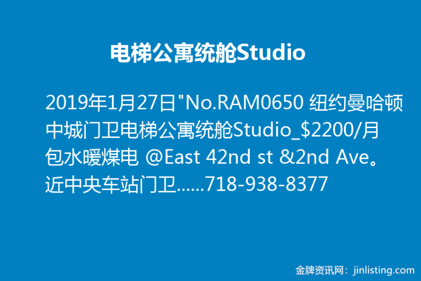 “No.RAM0650 纽约曼哈顿中城门卫电梯公寓统舱Studio_$2200/月包水暖煤电 @East 42nd st &2nd Ave。 近中央车站门卫电梯公寓带家具统舱公寓。 转租租期:2/15/2019-9/15/2019,拎包入住。包水暖煤电,需佣金。 另有大量曼哈顿和Queens纽约市区出租,出售房源,欢迎来电或是来信询问喔! 咨询服务:王小姐(Wendy) 电话或微信可以预约当天看房。电话:718-938-8377 微信:Q612597”