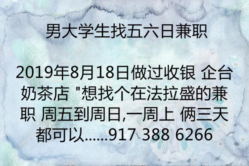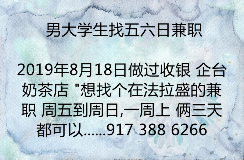 男大学生找五六日兼职, 做过收银 企台 奶茶店 “想找个在法拉盛的兼职 周五到周日,一周上 俩三天都可以 九月前可以其他时间也上班 熟悉学习 之前暑假俩个多月在快餐店做full time收银 曾在川菜馆做PT企台,做了一年多 也在奶茶店和street fair(果汁奶茶smoothie) PT过 电话917 388 6266 若电话没接到请发一下短信 谢谢老板”