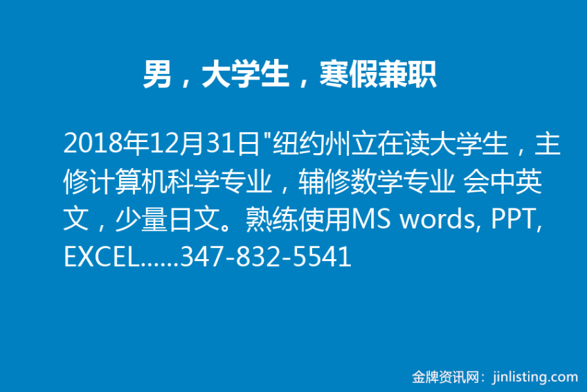 “纽约州立在读大学生,主修计算机科学专业,辅修数学专业