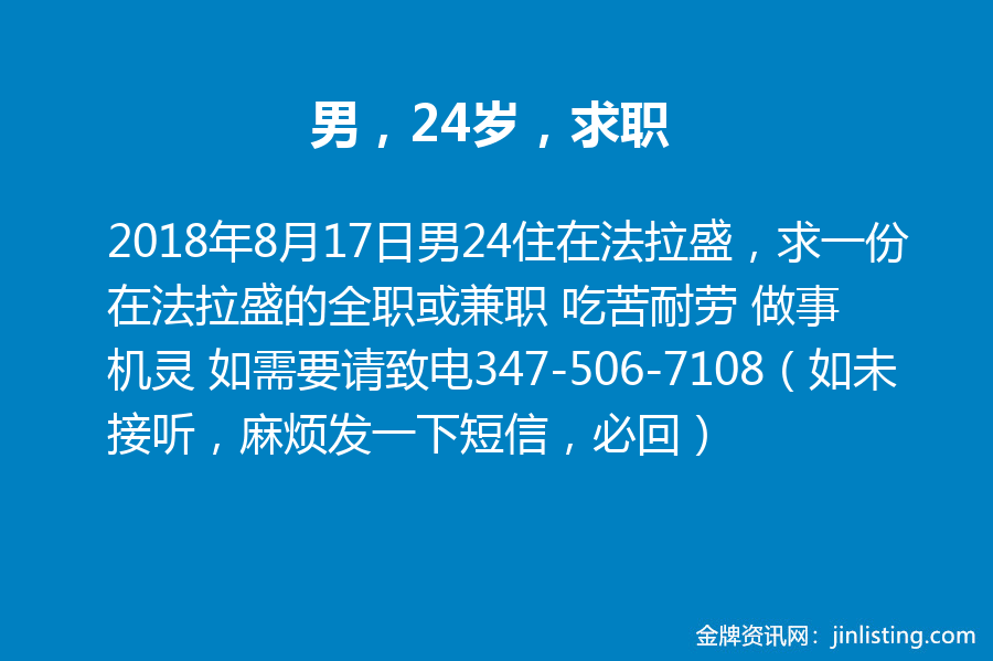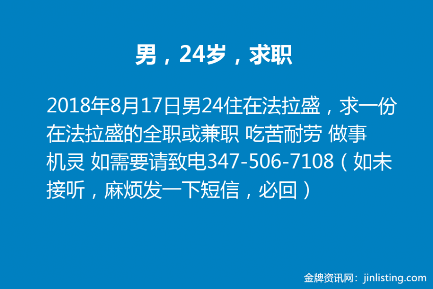 男 24 住在法拉盛,求一份在法拉盛的全职或兼职 吃苦耐劳 做事机灵 如需要请致电347-506-7108(如未接听,麻烦发一下短信,必回)