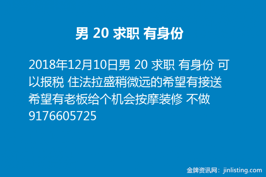 男 20 求职 有身份 可以报税 住法拉盛稍微远的希望有接送 希望有老板给个机会