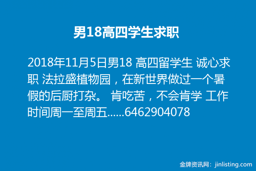 男18 高四留学生 诚心求职 法拉盛植物园,在新世界做过一个暑假的后厨打杂。 肯吃苦,不会肯学 工作时间周一至周五3:00pm-12:00pm 周六周末全天 微信Leroy1005 手机号6462904078 按摩勿扰,谢谢