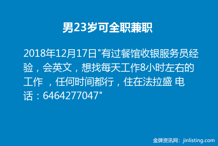 “有过餐馆收银服务员经验,会英文,想找每天工作8小时左右的工作 ,任何时间都行,住在法拉盛