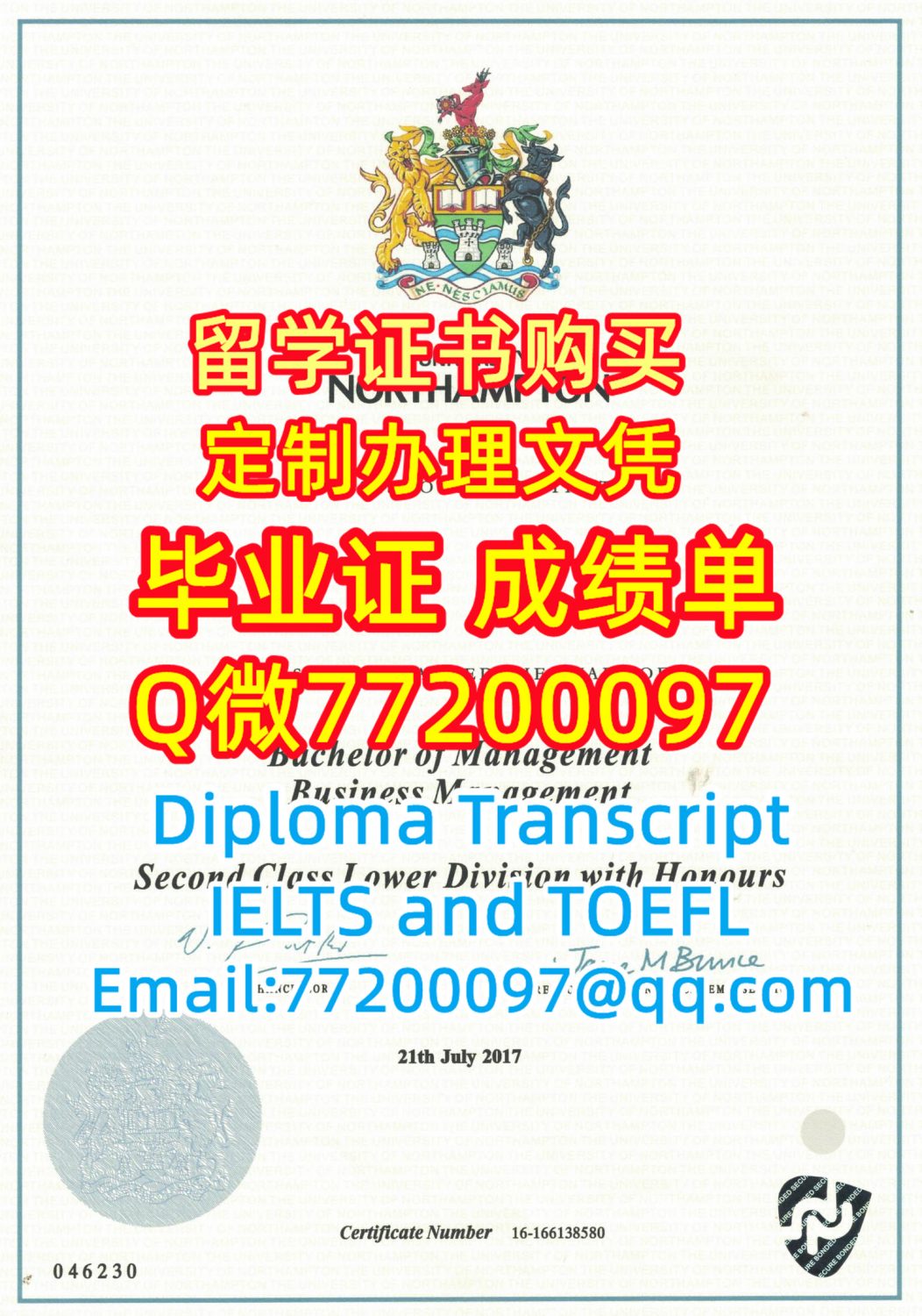 留学材料办理UoN毕业证成绩单专业办理北安普顿大学毕业证书Q/微:77200097有UoN文凭证书精仿UoN学位证书能办UoN成绩单制作北安普顿大学文凭证书雅思托福The University of Northampton Diploma Degree Transcript