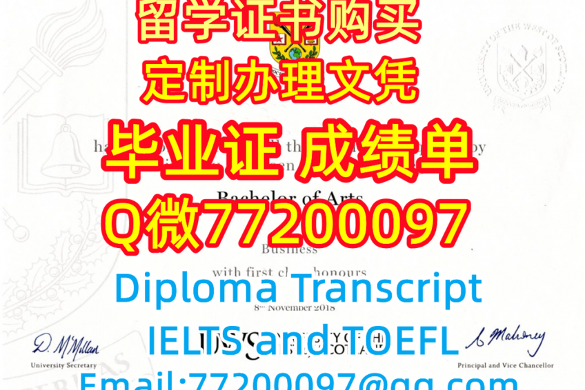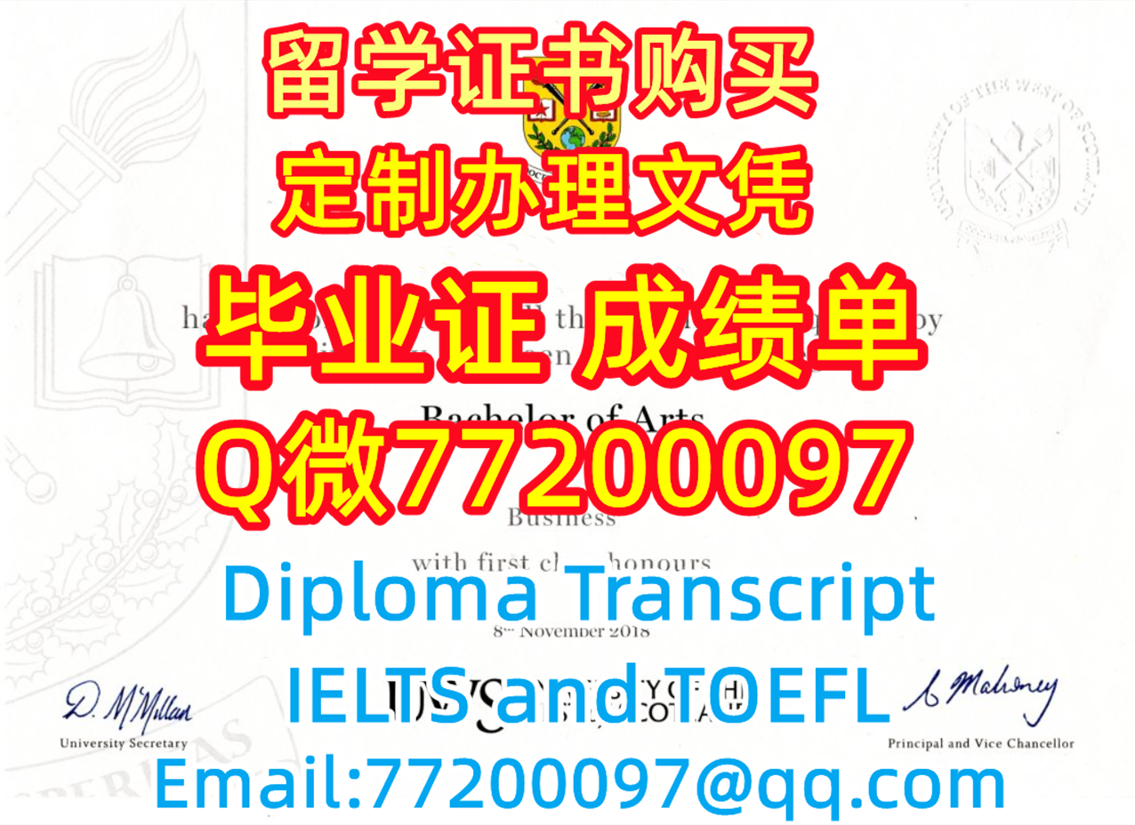 留学材料办理UWS毕业证成绩单专业办理西苏格兰大学毕业证书Q/微:77200097有UWS文凭证书精仿UWS学位证书能办UWS成绩单制作西苏格兰大学文凭证书雅思托福University of the West of Scotland Diploma Degree Transcript