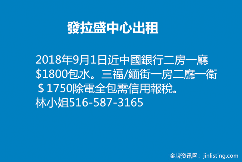 近中國銀行二房一廳$1800包水. 大三房一廳一衛$2500除電全包昌發超市後面約1200呎需信用. 三福/緬街一房二廳一衛$1750除電全包需信用報稅 金城發後面全新三房二衛一廳$2300只包水516-587-3165林小姐