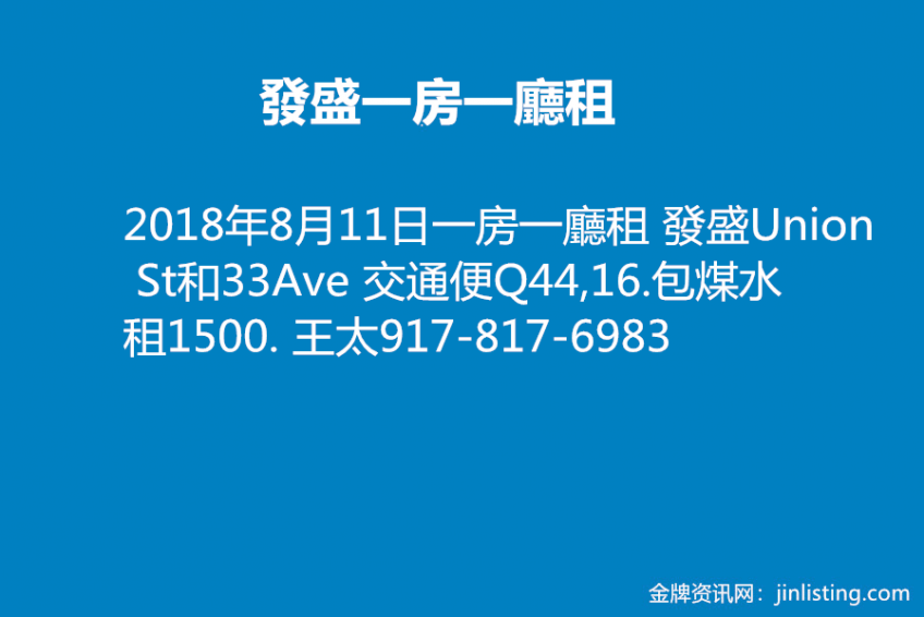 一房一廳租  發盛Union St 和 33 Ave. 交通便,Q 44,16. 包煤水. 租1500.     王太917 -817-6983