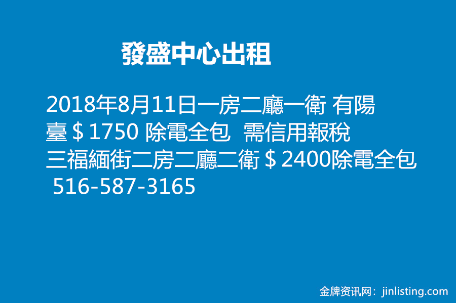 ●一房二廳一衛,有陽臺$1750,除電全包,需信用報稅 ●三福/緬街二房二廳二衛,$2400除電全包 ●二房一大廳一衛$1900,只包水不吸菸。 516-587-3165林小姐
