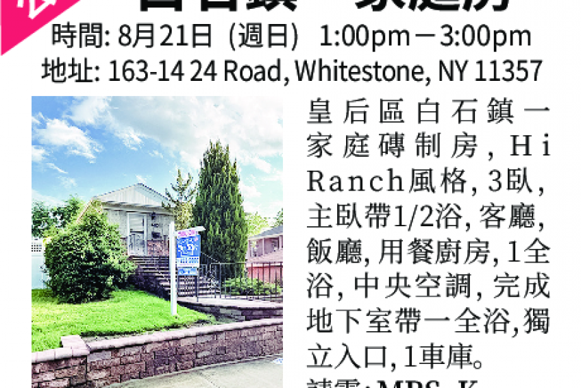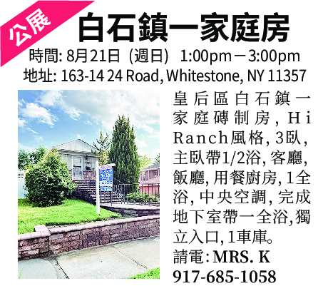 公展時間:8月21日 (週日) 中午 1 點 至 下午 3 點地址:163-14 24 Road, Whitestone, NY 11357皇后區白石鎮(Whitestone)一家庭磚制房,Hi Ranch風格,