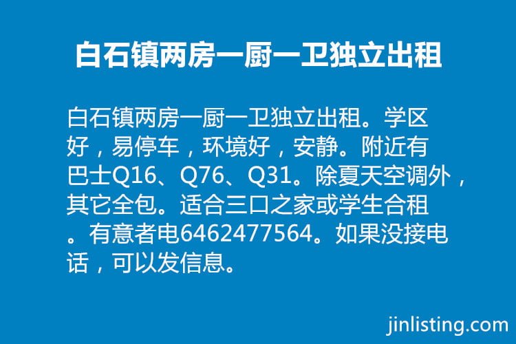 白石镇两房一厨一卫独立出租。学区好,易停车,环境好,安静。附近有巴士Q16、Q76、Q31。除夏天空调外,其它全包。适合三口之家或学生合租。有意者电6462477564。如果没接电话,可以发信息。