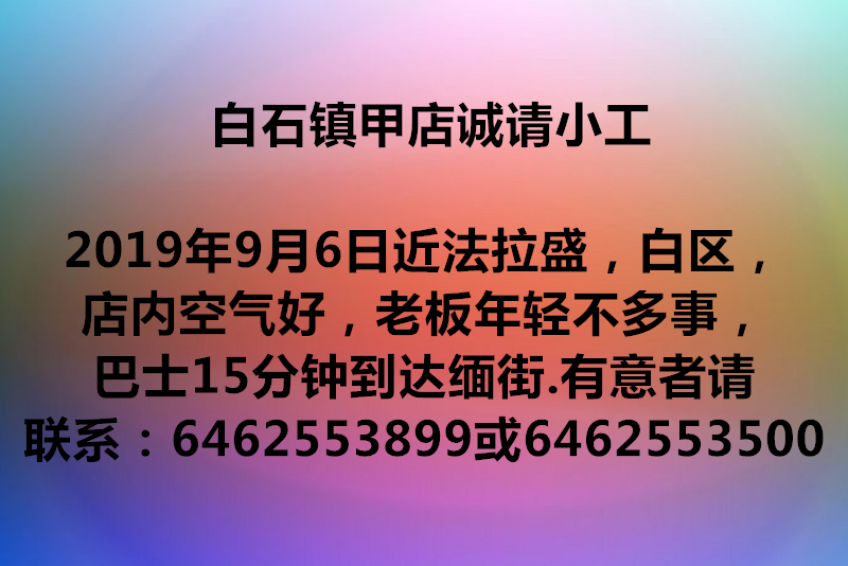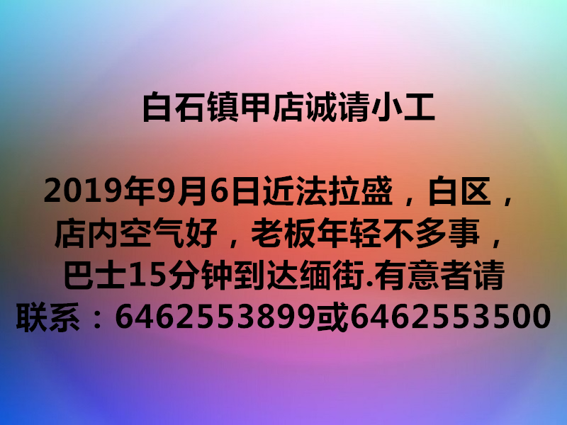 白石镇甲店诚请小工,近法拉盛,白区,店内空气好,老板年轻不多事,巴士15分钟到达缅街.有意者请联系:6462553899或6462553500
