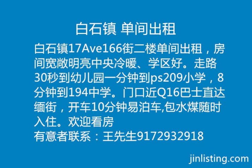 白石镇17Ave166街二楼单间出租,房间宽敞明亮中央冷暖、学区好。走路30秒到幼儿园一分钟到ps209小学,8分钟到194中学。门口近Q16巴士直达缅街,开车10分钟易泊车,包水煤随时入住。欢迎看房有意者联系:王先生9172932918