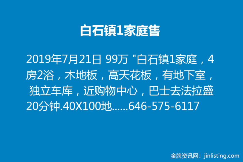 白石镇1家庭售99万 “白石镇1家庭,4房2浴,木地板,高天花板,有地下室, 独立车库,近购物中心,巴士去法拉盛20分钟。 40X100地,售99万,欢迎合作。 法拉盛罗斯福大道7楼(顶楼是8楼) 中国超市5分钟,7号地铁10分钟。 2房2卫2个阳台,免费一个车位, 室内有洗衣和烘干机。 约700尺,有电梯,管理费252/月, 地税:435/月。售62万, 电话:646-575-6117 微信:mynewyork4308”