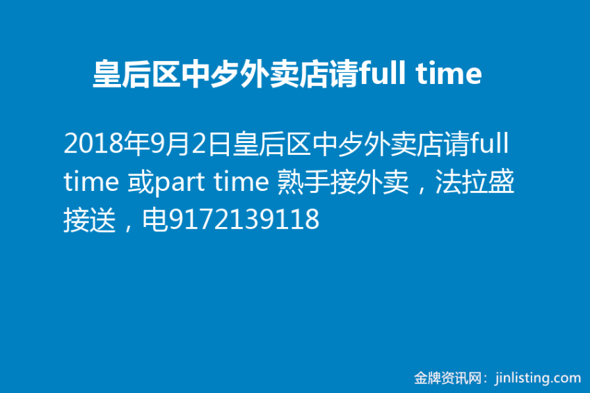 皇后区中歺外卖店请full time 或part time 熟手接外卖,法拉盛接送,电9172139118