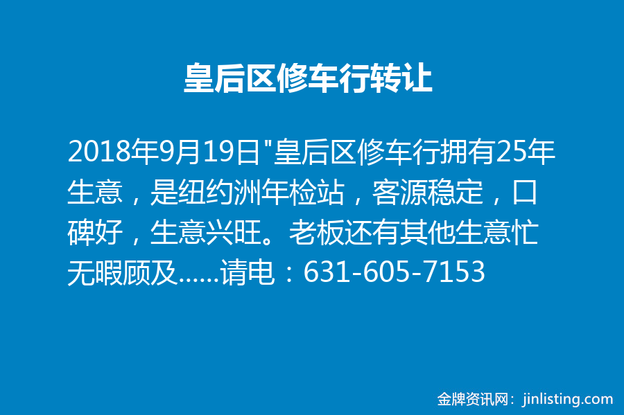 皇后区修车行转让 “皇后区修车行拥有25年生意,是纽约洲年检站,客源稳定,口碑好,生意兴旺。老板还有其他生意忙无暇顾及,故此转让。本店厂房5400尺,宽敞明亮,地理位置优越,周边车流量大交通方便。有8年合约,年纯利15万,有经验及经营有道者获利更高。本店设备齐全,随店转让价值10万的维修设备,详细清单如下。有意者可查看及面议价格,请电:631-605-7153 QC 汽车修理厂设备清单 设备名称 数量 设备名称 数量 检测仪 1 千斤顶底座 6 升降机 5 新引擎提升机 1 拆装轮胎机 1 旧引擎提升机 1 轮胎平衡机 1 20吨商用轴承替换机 1 压缩避震器 1 60瓦LED 工作灯 4 电池充电器 1 L 型拉大梁机 1 千斤顶 5 切割刹车盘及刹车鼓机器 1 电焊机 1 氧乙炔切割焊接设备 1 保护焊 1 新变速箱顶 1 全自动维修冷气设备 1 旧变速箱顶 1 吸尘器 1 提升机底座 2 大型空压机 1 清洗机 1”