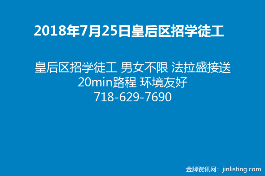 皇后区招学徒工 男女不限 法拉盛接送 20min路程 环境友好 718-629-7690