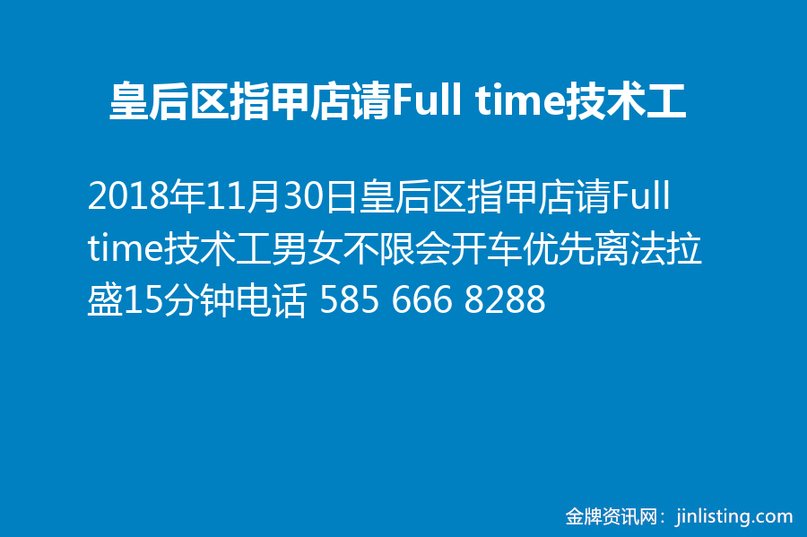 皇后区指甲店请Full time技术工男女不限会开车优先离法拉盛15分钟电话 585 666 8288