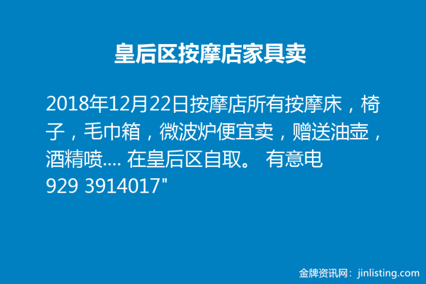 皇后区按摩店家具卖,卖卖 “按摩店所有按摩床,椅子,毛巾箱,微波炉便宜卖,赠送油壶,酒精喷…. 在皇后区自取。 有意电 929 3914017”