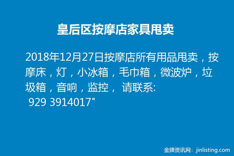 皇后区按摩店家具甩卖 “按摩店所有用品甩卖,按摩床,灯,小冰箱,毛巾箱,微波炉,垃圾箱,音响,监控, 请联系: 929 3914017”