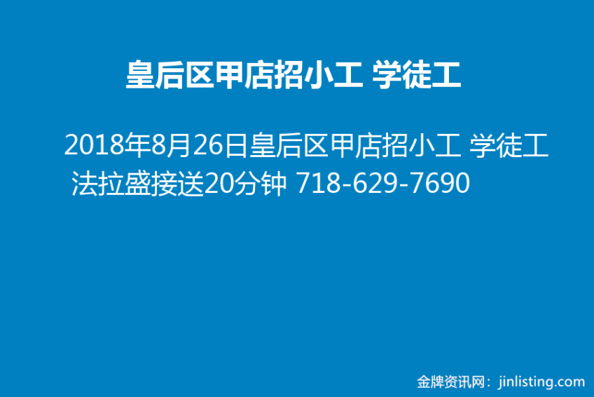 皇后区甲店招小工 学徒工 法拉盛接送20分钟 718-629-7690