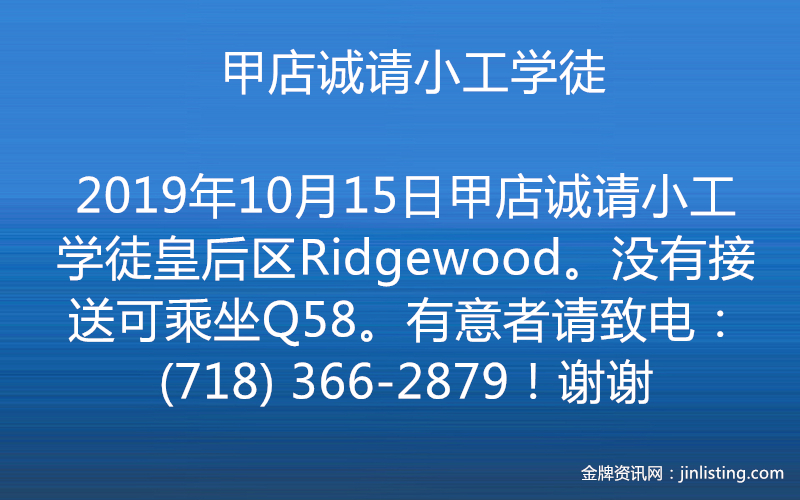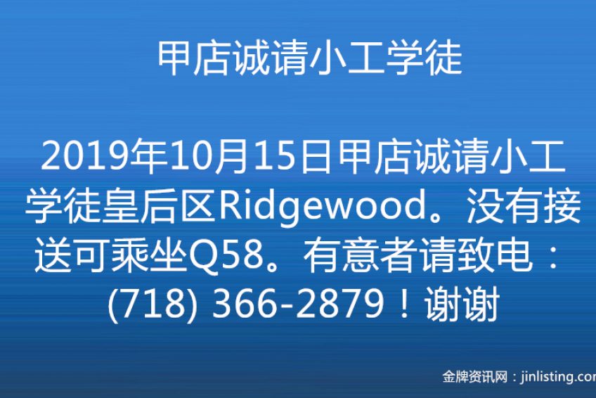 皇后区Ridgewood 甲店诚请小工学徒。没有接送可乘坐Q58。有意者请致电:(718) 366-2879!谢谢 甲店请人