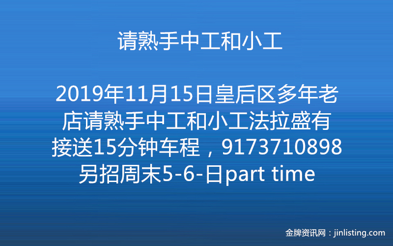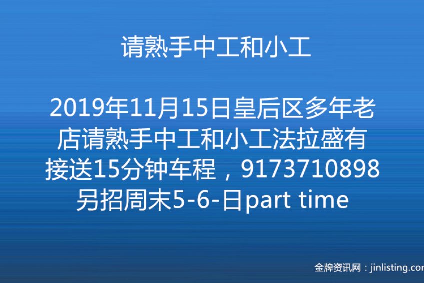 皇后区多年老店请熟手中工和小工法拉盛有接送15分钟车程,9173710898另招周末5-6-日part time