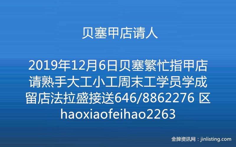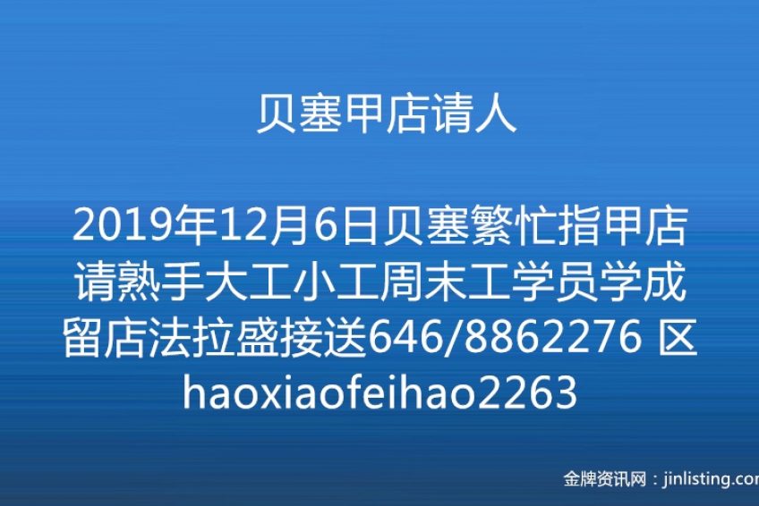 贝塞繁忙指甲店请熟手大工小工周末工学员学成留店法拉盛接送646/8862276 区haoxiaofeihao2263