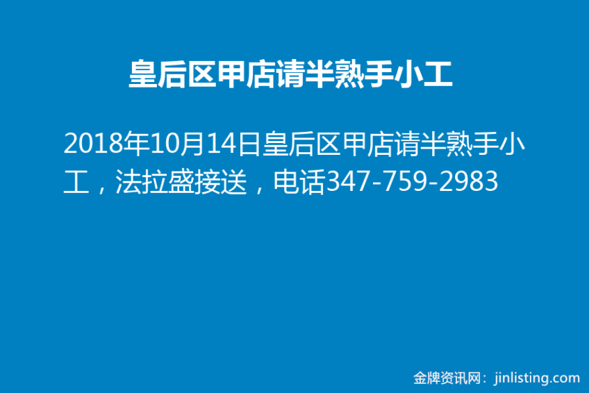 皇后区甲店请半熟手小工,法拉盛接送,电话347-759-2983
