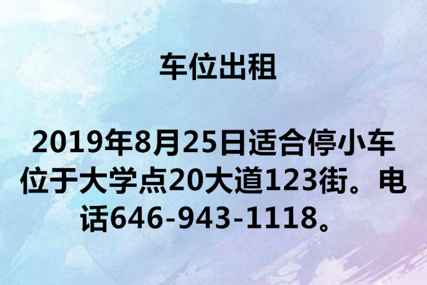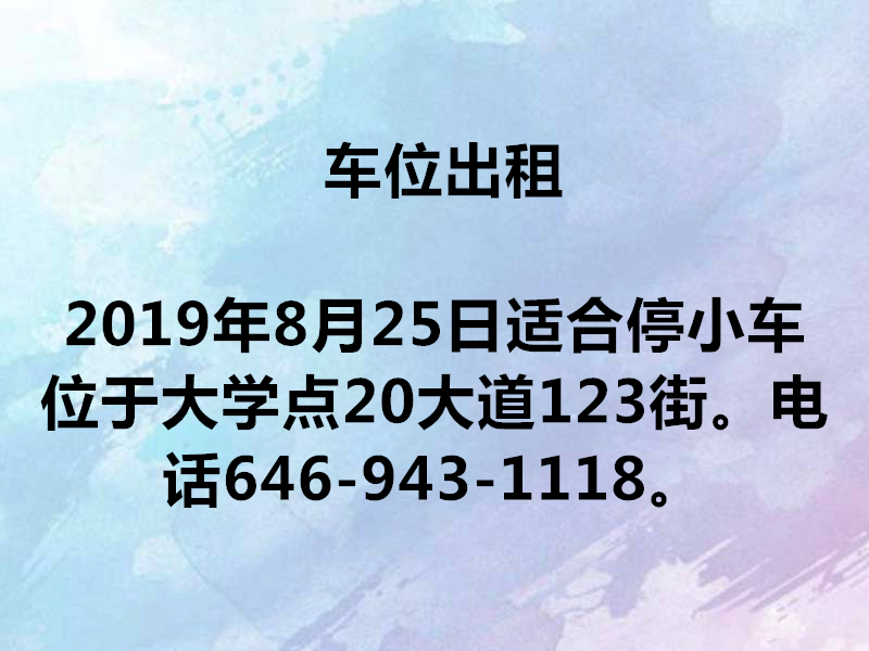 车位出租,适合停小车。位于大学点20大道123街。电话646-943-1118。