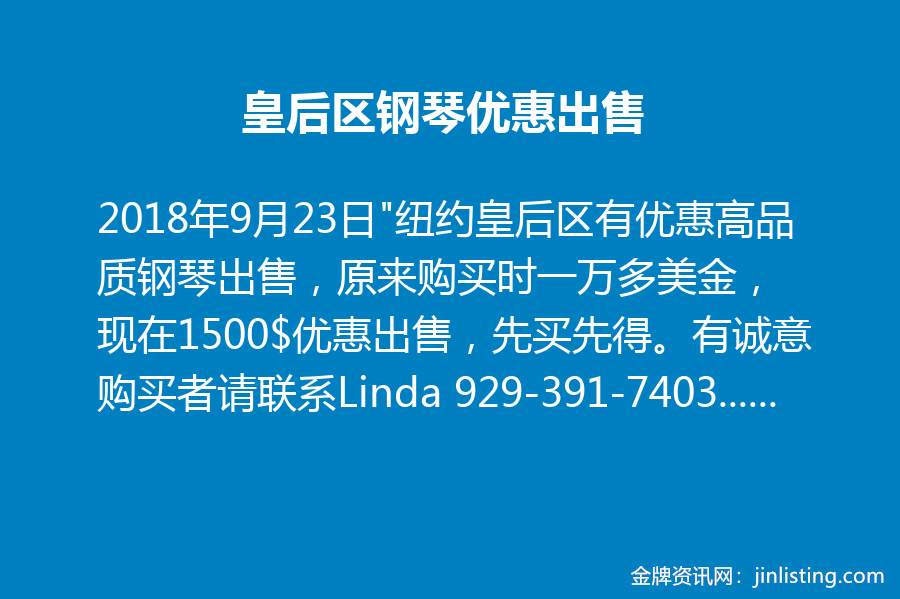皇后区钢琴优惠出售 “纽约皇后区有优惠高品质钢琴出售,原来购买时一万多美金, 现在1500$优惠出售,先买先得。有诚意购买者请联系Linda 929-391-7403, 微信:Lindawell898,钢琴资料通过短信联系,[code]”