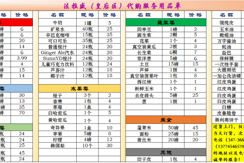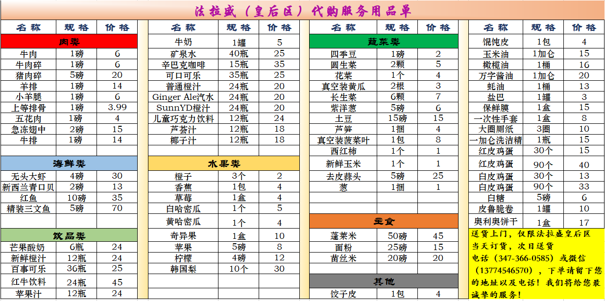 皇后区&长岛食品送货上门服务详情请电347-366-0585无人接听请发信息或加微信13774546570 谢谢!